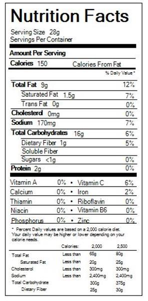 Already have an account. PLEASE KEEP SELLING THEM. 210 Calories 12g Fat 22g Carbohydrates 2g Fiber 1g Sugar 3g Protein 230mg Sodium 0mg Cholesterol 470mg Potassium.