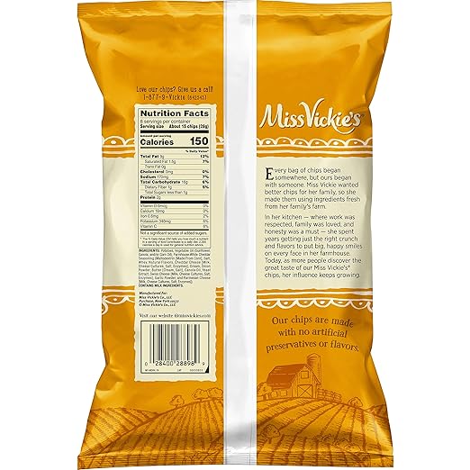 Nutritional information for Miss Vickies Farmhouse White Cheddar Potato Chips. Buy Frito-Lay snacks on Amazon ad. 10 package Servings per Container.